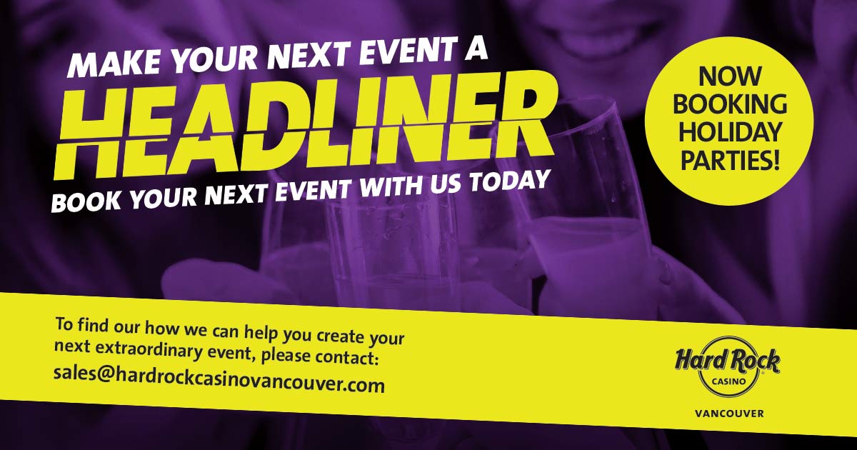 Hard Rock Casino Vancouver is home to everything you go out for! Unparalleled entertainment, gaming, and restaurant options make us the perfect choice for anyone looking for things to do in Vancouver. Our gaming floor offers 951 slot machines and a number of table games like blackjack, roulette and baccarat. Our 1,100 seat theatre hosts some of the best Vancouver concerts, comedy shows, and performances. Hard Rock Casino Vancouver also boasts a variety of restaurants serving lunch, dinner, and late night eats. The excitement of our casino floor, amazing events, and restaurant selections for everyone – Hard Rock Casino Vancouver has it all!